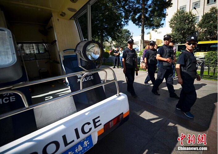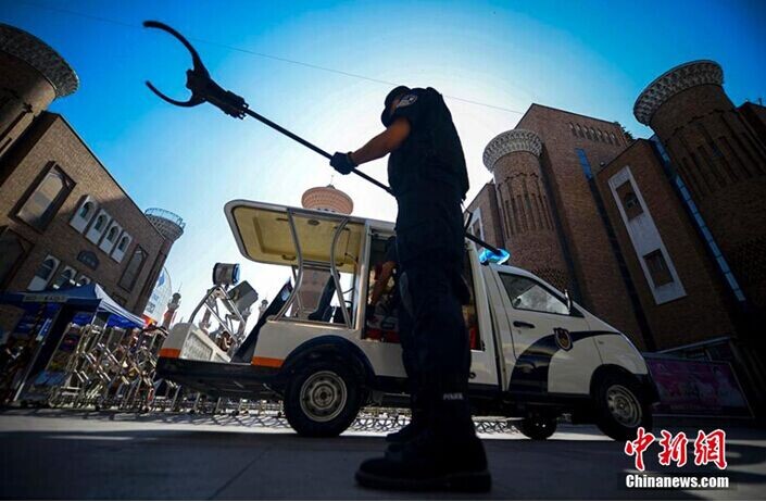 8月28日,一輛新型反恐電動(dòng)巡邏車(chē)亮相新疆首府烏魯木齊市國際大巴扎,該車(chē)由電力驅