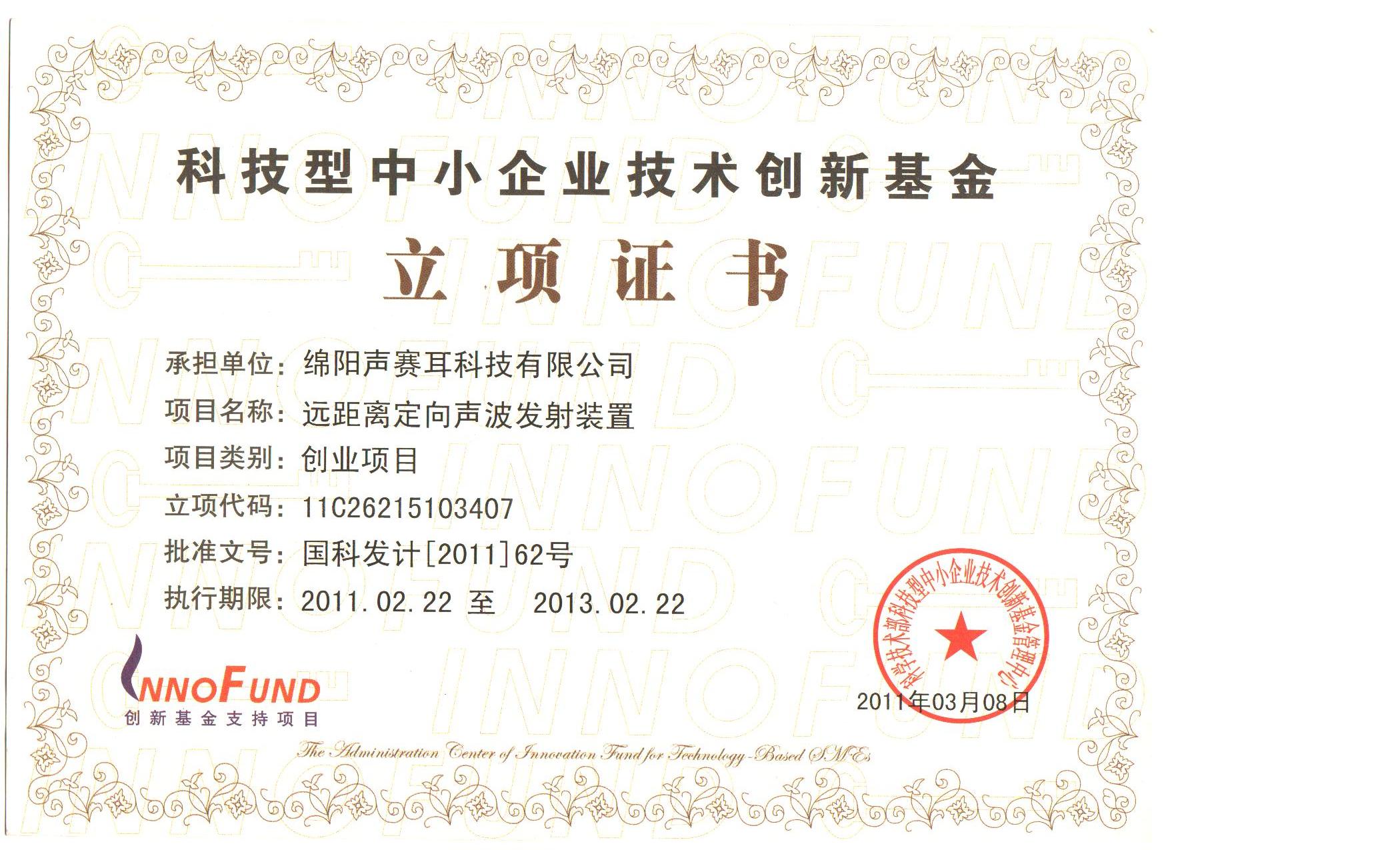 2011年9月16日,我公司正式取得中華人民共和國科學(xué)技術(shù)部中小企業(yè)技術(shù)創(chuàng )新基金管理中心簽發(fā)的“遠距離定向聲波發(fā)射裝置”立項證書(shū),這標志著(zhù)我公司科技創(chuàng )新取得重大突破。